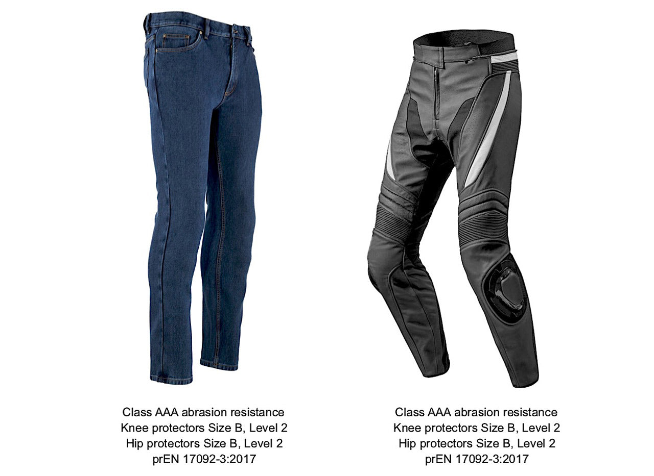 • Maximum Protection: Unique motorcycle denim fabrics impact abrasion resistance (Darmstadt) prEN 17092-1:2017 AAA Rating. 4 removable Hip and Knee protectors. Body Armor Classification: EN 1621-1: Type B Level 2 (knee), Type B Level 1 (hip). Knee protectors are adjustable in 3 heights.