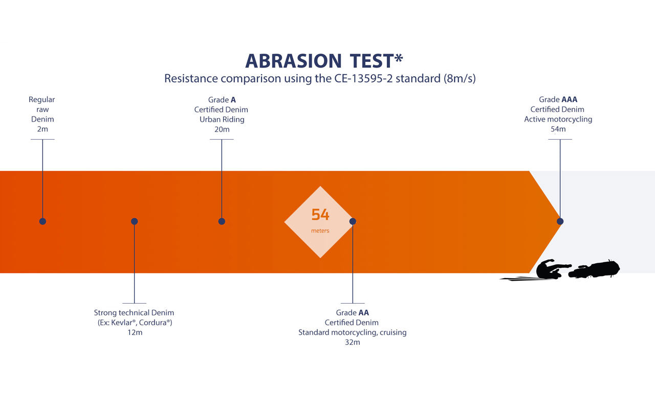 The AAA Abrasion proof rating, according to the most strict EN17092 standard, means that Denim material doesn't melt or tear when sliding on rough concrete from a speed of 120km/h to a standstill. That‘s the highest possible rating, previously only possible with natural leather. There‘s no higher standard than this. MotoGP suits are certified for AAA.