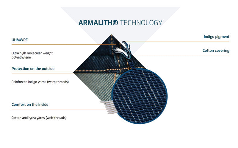 The name of the new fabric is Armalith and it's designed in France. The basis of both Dyneema and Armalith is UHMWPE - Ultra High Molecular Weight Polyethylene - a synthetic material 15 times stronger than steel. However, Armalith uses different weaving technology. Every Armalith yarn is a composite of the UHMWPE core and Indigo cotton covering. This gives the possibility to use more UHMWPE without losing the comfortable properties of regular Denim.