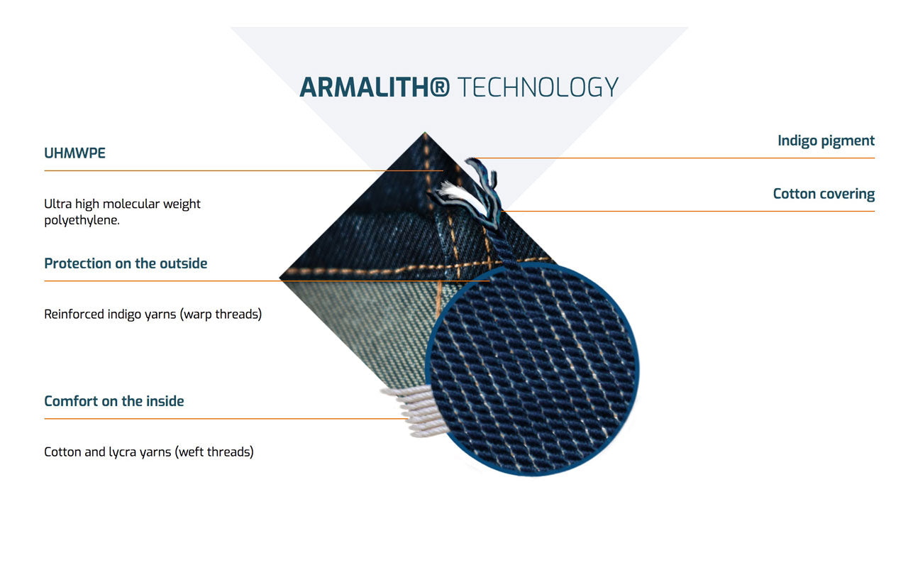 • Breathable Material: Expertly crafted Double Face Denim - Weft Stretch. 50% Cotton / 43% Ultra High Molecular Weight Polyethylene (Armalith®) / 6% Nylon / 1% Elastane